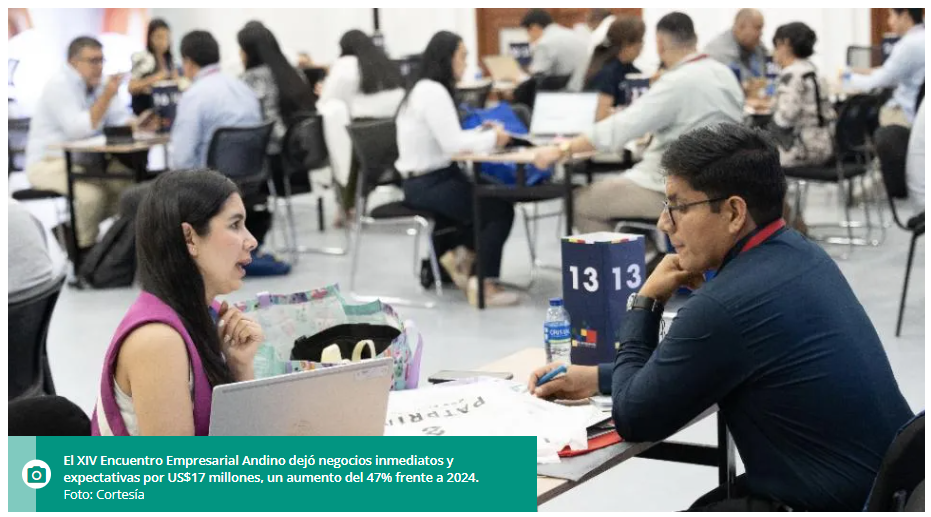 https://www.portafolio.co/negocios/comercio/encuentro-empresarial-andino-2025-dejo-negocios-por-us-17-millones-en-monteria-640632 El XIV Encuentro Empresarial Andino (EEA), que se llevó a cabo en Montería, Córdoba, dejó negocios inmediatos por US$1,7 millones y expectativas de negocio cercanas a los US$15,2 millones. En total, los compromisos alcanzaron los US$17 millones en el canal de distribución y comercialización Horeca, enfocado en hoteles, restaurantes y cafeterías, así como en industrias conexas. […]
